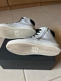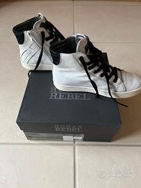 Sneakers alte, realizzate in pelle bianca, con H laterale, suola in gomma con scanalature e logo sul retro, interno in pelle, chiusura con lacci neri originali e zip bianca, punta tonda. Indossate poco. Prezzo acquisto € 160. Taglia 32