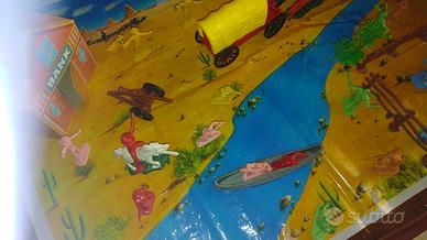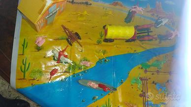 vendo piccolo diorama composto da ambientazione,10 soldati diversi,10 indiani diversi,carro,banca e decorazioni,ottimo stato,conservati in una scatola data la perdita della plastica originale.