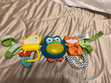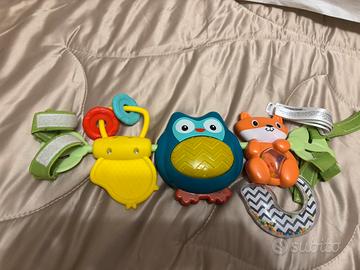 – Premi la pancia del gufo per riprodurre le luci e una divertente musica. Gioca con gli anelli dell’uccellino o scuoti la volpe per sentire il tintinnio delle palline.