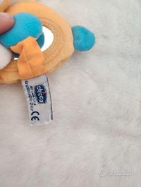 Sonaglio animaletto. Strutturato con materiali diversi: tocca le orecchie per sentire un fruscio divertente, guarda nello specchietto sulla pancia per scoprire il suo visino.