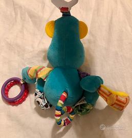 La linea Play & Grow è indicata dai primi mesi di vita fino ai 2 anni dl tuo bambino. Grazie a tessuti suoni e accessori differenti stimolerà la fantasia e la curiosità dei vostri bimbi. Il pupazzetto è dotato di un'anello in plastica che permette di attaccarlo al passeggino, al lettino oppure ovunque vogliate per portarlo sempre con voi. Coloratissima scimmietta (per stimolare la vista) che maneggiata dal bambino produce un suono simile al verso tipico delle scimmie, realizzato con vari tessuti che stimolano il tatto (toccare ed afferrare superficie diverse affina le capacità motorie) e divertono il bimbo, infatti alcuni tessuti emettono suoni ( scricchiolano stimolando lo sviluppo uditivo). Inoltre è dotato di: 2 anelli per la dentizione A partire dai 0 mesi Articolo sonoro Misure articolo: 15.24 cm x 10.16 cm x 25.40 cm