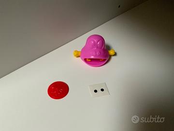 questo oggetto sempre dell’uovo Kinder spara un disco rosso dalla bocca il movimento per farlo sparare è molto facile basta inserire bene il disco della bocca,stringere i due bastoncini gialli all’esterno del giochino verso in avanti e il disco, avendo una pressione uscirà fuori dalla bocca sparato. Consigliato per i bambini dai 3 ai 6 anni.