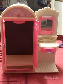 specchiera Barbie vintage anni 70 vendo perché non più giocata. È usata, (dalla foto si vede infatti che manca, ed è stata sostituita,una maniglia originale del cassetto sotto lo specchio)ma funzionante, la luce funziona con le batterie .
