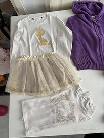Lotto di abbigliamento per bambina, taglia 3/4 anni. In tutti gli indumenti indicato 4 anni ..solo la gonna 3/4 anni. tutti i capi sono dei migliori brand come Lisa Rose( mantellina ) , Zara ( gonna) ecc. Tutti lavati, disinfettati e stirati senza strappi rotture o macchie.