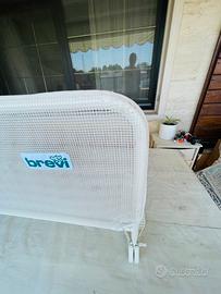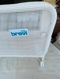 L'oggetto nell'immagine è una sponda di sicurezza per letto (o barriera anticaduta) a marchio Brevi, progettata per evitare che i bambini cadano dal letto durante il sonno. Caratteristiche del Prodotto Dimensioni: Questo modello specifico ha solitamente una lunghezza di 90 cm e un'altezza di circa 40-47 cm. Materiali: È composta da un telaio in metallo rivestito da una rete traspirante che permette la circolazione dell'aria e la visibilità. Installazione: Si fissa facilmente incastrando la base sotto il materasso. Alcuni modelli includono cinghie aggiuntive per un ancoraggio più saldo alla struttura del letto. Praticità: È universale e adatta a quasi tutti i tipi di letto (tranne quelli a castello). Spesso non è necessario rimuoverla per rifare il letto.