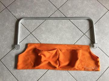 Ciascuna sponda è ricoperta da una bellissima cuffia rimuovibile in tessuto arancione mandarino, con chiusura a strappo e con due ampie tasche (20x25 cm) per contenere giochi e pupazzi.