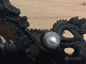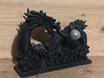 Statuetta di drago cinese in resina con sfera, dettagli complessi sulle squame.