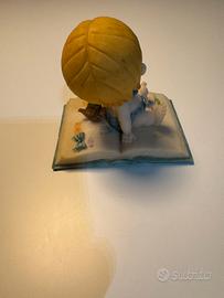 Oggetto in resina per celebrare la nascita di un bambino. Sono visibili un libro, su cui é seduto il bambino, un cagnolino, un biberon e un orsetto
