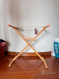 stendino giocattolo per bambini misura ottimo per giocare e apprendere, può essere usato come un vero stendino dai nostri piccoli o per appendere disegni che necessitano asciugatura versatile e interamente in legno o per appendere i vestitini della bambole. DOTATO DELLE SUE MOLLETTE DI LEGNO E 2 APPENDINI