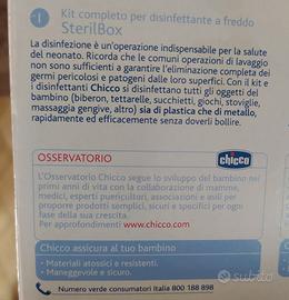 Kit sterilizzatore a freddo Chicco. Composto da vano porta biberon. Elemento Appoggia ciucci. Pinsa igienica e spazzola per pulizia biberon.
