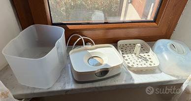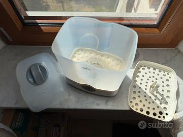 Lo sterilizzatore Chicco sterilizza fino a 6 biberon da 330 ml, tiralatte e ciucci in soli 5 minuti tramite il vapore naturale, senza bisogno di aggiungere nessun tipo di additivo chimico. Elimina il 99,9% dei germi grazie alla forza igienizzante del vapore; non necessita di risciacqui e si spegne automaticamente a fine ciclo. Gli oggetti sterilizzati rimangono disinfettati per 24 ore se il coperchio rimane chiuso. Perfettamente funzionante, l’unico difetto è che si e un po ossidato in fondo vedi ultima foto.