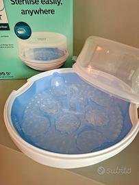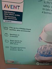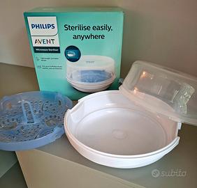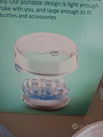 Sterilizzatore biberon microonde Philips Avent. Nuovissimo, ancora con scatola e istruzioni. Adatto a ciucci e biberon di qualsiasi dimensione. Dimensioni: 28 cm di diametro x 16,6 altezza.