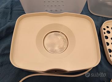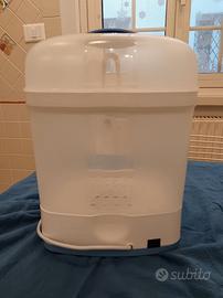 Sterilizzatore marca Chicco a due ripiani, ottimo per sterilizzare, senza sostanze chimiche e in pochi minuti, biberon, elementi del tiralatte e succhietti (funziona col vapore acqueo) . L'oggetto è stato usato, ma è in ottime condizioni. Unico segno di usura, che comunque non compromette l'efficacia dell'apparecchio, si nota nella foto con la piastra metallica (dove si mette l'acqua per fare il vapore).