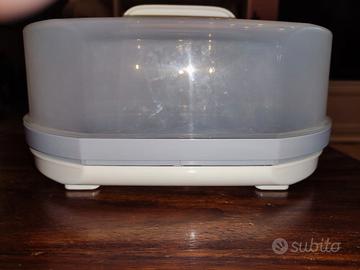 Vendo sterilizzatore maxi, può essere usato a corrente se si ha bisogno di sterilizzare molti biberon, ciucci ecc...sia nel microonde diminuendo la dimensione come in foto. Secondo prodotto scalda biberon Chicco.