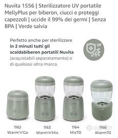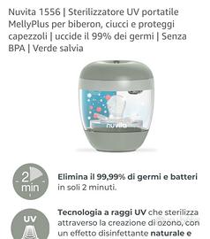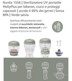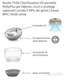 Sterilizzatore portatile a raggi UV - MellyPlus 1556 Sterilizza in modo pratico e veloce tutti i modelli di succhietti, tettarelle e interno biberon. Tecnologia a raggi UV, elimina il 99,9% dei germi e batteri in 2 minuti. Piccolo e compatto, comodo da tenere in borsa. Utilizzabile per sterilizzare tutti gli scaldabiberon portatili Nuvita o di qualsiasi altra marca.