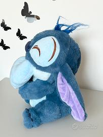 Dolcissimo peluche raffigurante Stitch teneramente abbracciato ad un cuore e gli occhi chiusi.