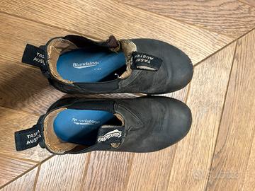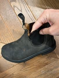 Stivaletti in pelle con para di gomma, marca Blundstone, numero 13 che corrisponde al numero 31.5. Colore “rustic black”.