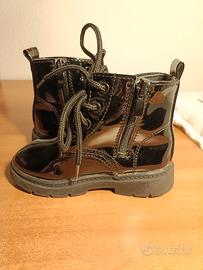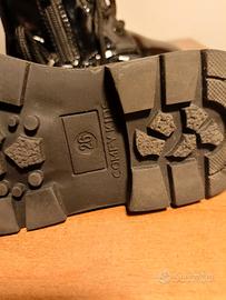 Scarponcini tipo anfibio bimba in simil vernice nera. Lacci frontali e zip laterale per facilitare la calzata. Suola in gomma spessa. Taglia 26.