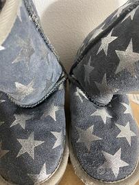Colore grigio / blu con stelline argentate. Con calda pelliccia all’interno. Modello tipo Ugg.