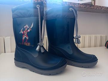 Stivaletti impermeabili blu con disegno del pirata. Taglia 27, praticamente nuovi, con laccetto superiore di chiusura. 10€.