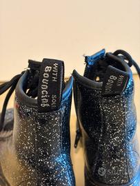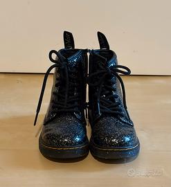 Stivali Dr. Martens per bambina con una finitura glitterata scintillante. Perfetti per aggiungere un tocco di magia a ogni outfit. Numero 28.