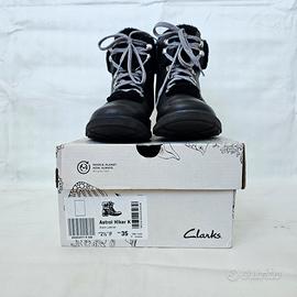 Stivaletto invernale nero in pelle marca Clarks, misura 35, con pellicciotto sintetico.