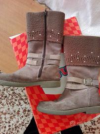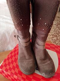 2) Mkids originali, colore marrone, in camoscio, imbottiti, fascia superiore in maglia con paillettes, suola in gomma, misura 35, in buono stato