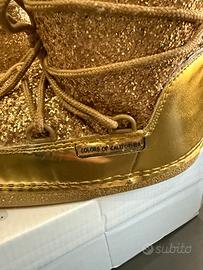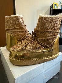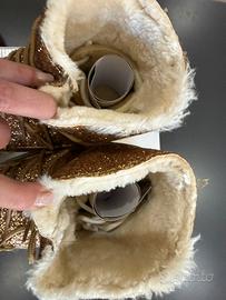 Stivaletti pioggia adatti anche come doposcì da bambina n. 33 nuovi mai indossati color oro con brillantini e doppi lacci (oro e bianchi) felpati all’interno. Nuovi, numero 33