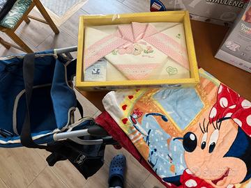 Seggiolino sospeso chicco da tavolo + telo da mare bimba + tira latte manuale Tomee Tippee + zaino seven con carrello + gommone da mare gonfiabile + completo per culletta lenzuolo +3 scatole di giochi