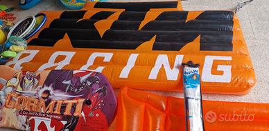 Lo stock è composto come da foto da: formine, secchielli ecc,una maschera subacquea, due materassini di cui uno KTM Racing, canottini per bimbi piccoli, un acquilone ancora nella confezione mai usato, una pompa per il gonfiaggio ancora sigillata e mai usata , 3 paia di racchettoni uno dei quali NERF , una tavoletta dei Gormiti, birilli mai usati un kit di minigolf ecc . ecc. Vendo per fare spazio