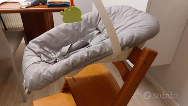 Newborn set per sedia evolutiva Tripp Trapp della Stokke. Usato pochissimo, come nuovo. Condizioni ottime. Con asta portagiochi, piedini e scatola originale. Adatto dalla nascita e fino a 6 mesi, 9kg circa. Cinture a 5 punti, indicatore di sicurezza verde/rosso, cuscino morbido e lavabile in lavatrice. Reclinabile in 2 posizioni.