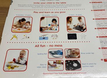 Vassoio con bordo sagomato da attaccare al tavolo. 3 tovagliette con motivi diversi da utilizzare su entrambi i lati.
