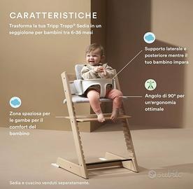 Trasforma la classica sedia Tripp Trapp in un seggiolone con il Baby Set 2 Tripp Trapp. Fornisce un comodo supporto laterale e posteriore completo di cuscino orginale Stokke.