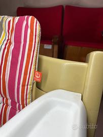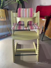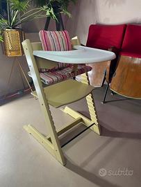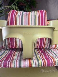 Stokke Tripp Trap + Vassoio Stokke + Baby Set Stokke + Cuscino Tripp Trapp, originale, regolabile. Ottimo stato solo alcuni segni di usura sul seggiolone, no strappi o macchie sui cuscini come nuovi, vassoio e baby set come nuovi.