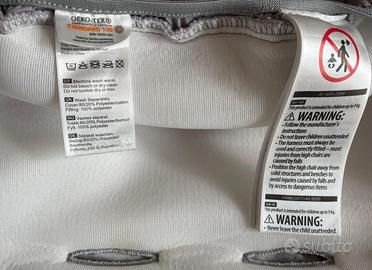Età raccomandata: da 0 (mesi). Materiali: Materiali in cotone biologico, superficie idrorepellente e facile da pulire, priva di PFC. La base in plastica è sicura e priva di BPA. Plastica realizzata in polipropilene (PP), priva di BPA. Materiali tessuti: 80% poliestere, 20% cotone, interno 100% poliestere.