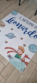 Striscione in pvc da esterno. Tema Piccolo Principe. Il Battesimo di Leonardo. Utilizzato una sola volta in occasione del Battesimo. Misura 1 mtx1mt. Condizioni pari al nuovo.