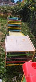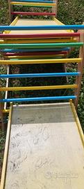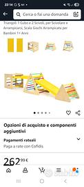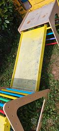 struttura in legno da arrampicata con 2 triangoli di diverse dimensioni, 2 scivoli che girandoli fanno da arrampicata,1 cubo.