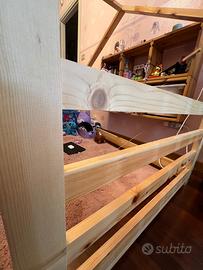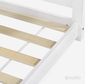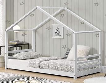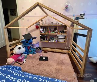Letto a Casetta per cameretta Bambini Struttura in Legno di Pino naturale Colore: pino naturale (le fotografie con struttura bianca sono puramente dimostrative) Marca: [en.casa] In Stile Montessori. Usato POCO solo come casetta e non come letto (le doghe non sono mai state usate). Adatto per un materasso di misura 80x160 cm. Il letto presenta una struttura a casetta con tettuccio a capanna e quattro colonne angolari. Il design stimola l'immaginazione del bambino, trasformando il momento del sonno in un'avventura quotidiana. MATERIALE: Il legno di pino è noto per la sua resistenza e longevità. STILE Montessori: La zona di riposo è posizionata al livello basso, favorendo l'indipendenza del bambino e consentendogli di salire e scendere dal letto con facilità. STRUTTURA: Le colonne angolari sono collegate da testiera e pediera costruite con tre listelli orizzontali ciascuna, aggiungendo stabilità e un tocco decorativo al design complessivo. Questi elementi non solo rafforzano la struttura del letto, ma contribuiscono anche a creare un aspetto armonioso e ben bilanciato. Difetti: presenta solo qualche foro da puntina.