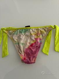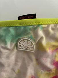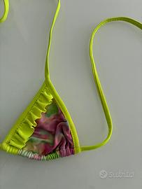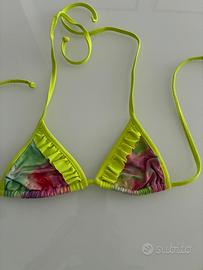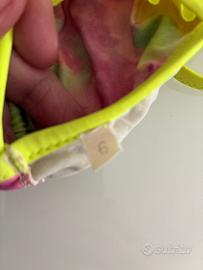 Bikini per bimba tg 6 anni originale SUNDEX. Colore gisllo fluo con sfumature multicolore. Rouges decorative nel reggiseno a triangolo e nello slip con fiocchetti laterali. Etichetta con logo stampato cucita posteriormente sullo slip. Ottimo stato