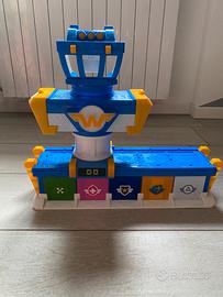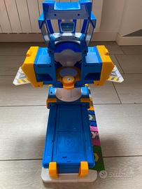 Torre di controllo e garage dei Transform-a-bot di 5 cm del cartone animato Super Wings; una volta posizionato l’aereo giocattolo nel garage, basterà posizionare la torre di controllo al di sopra e farla girare di 90° per aprire la porta del garage e far partire il Super Wings per la missione; è anche presente un ascensore all’altezza della torre di controllo per poter raggiungere la sala delle operazioni e le diverse piste di decollo disponibili; il playset è compatibile con i personaggi Transform-a-Bots.