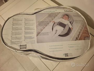 Supporto ergonomico inclinato per il sonno del neonato, con la sua confezione. Presenta qualche piccola macchia dovuta all'usura.