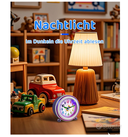 Sveglia da bambini analogica , con luce notturna a batteria , viola con tasto snooze Vendo Sveglia da bambini analogica , con luce notturna a batteria , viola con tasto snooze. Nuovo con scatola. Sveglia per bambini con numeri grandi , educativa per imparare divertendosi . Valido aiuto didattico per leggere l'ora, imparare le abitudini di sveglia , di ore , minuti , per lo studio , per il gioco , per la tv etc. Una leggera pressione attiva la luce notturna a basso consumo ,con illuminazione dolce e delicata. Che non disturba il sonno ma fa compagnia . Si può impostare delle sveglie e dei timer . Movimento delle lancette super silenzioso e preciso . Funziona a batteria standard non inclusa. Imparare l’ora Divertendosi:Con il quadrante colorato e numeri grandi, questa sveglia educativa rende semplice e coinvolgente l’apprendimento dell’orario per i bambini. Ideale già dalla scuola materna, è un valido aiuto didattico e un allegro complemento d’arredo per la cameretta Luce Notturna Rassicurante:Una leggera pressione attiva la luce notturna a basso consumo (si spegne automaticamente al rilascio). Così il bambino legge l’ora al buio senza paura, con un’illuminazione dolce che non disturba il sonno Sveglia Dolce con Funzione Snooze:Il pratico tasto snooze ripete la suoneria dopo 5 minuti: perfetto per i più pigri o le mattine frenetiche. Un risveglio graduale e sereno, ideale per abituarsi alle routine quotidiane Movimento Silenzioso:Grazie alla tecnologia di scansione avanzata, la sveglia è completamente silenziosa (nessun ticchettio fastidioso) e garantisce precisione assoluta. Ottima per bimbi sensibili al rumore e camere tranquille Regalo Perfetto:Batterie al carbonio-zinco (non incluse), senza fili e facile da usare anche per i più piccoli. Il regalo ideale per l’inizio della scuola, compleanni, Natale o la Befana: pratico, affidabile e amato dai bambini