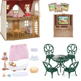 Tutti pezzi originali, Casa padronale completa di tutti gli accessori, camera da letto matrimoniale, cameretta gemelli, cucina, tv, accessori giardino /orto, bagno completo, lavatrice. Accessori acquistati separatamente Che completano L'esperienza di gioco. Chalet e casetta nel bosco, automobile. Personaggi inclusi.