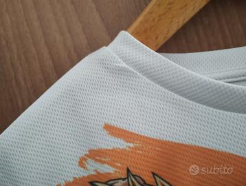 sportiva t-shirt in tessuto traspirante di colore bianca con scritte e fantasie multicolori. a maniche corte e girocollo. per bambini di 10-11 anni, 146 centimetri. al 100% in poliestere. marca Primark. la t-shirt è praticamente nuova. senza il minimo difetto viene spedita lavata e stirata.
