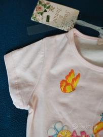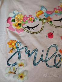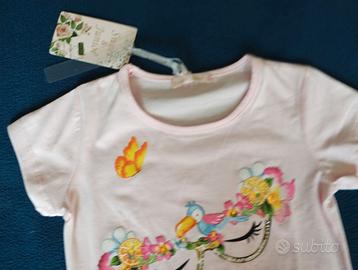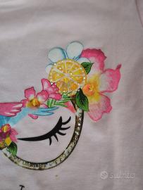 bellissima t-shirt a maniche corte di colore rosa con fantasie multicolori frontali. per bambine di 6 anni, 116 centimetri. Marca Sweet & Junior. la t-shirt è nuova con targhetta.