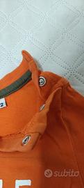 Con bottoni automatici sul collo. Scritta: the Crocodile corner chicos.....que pasa. Disegno del coccodrillo stampato. Laisla mujeres 83. Arancione a verde militare. 12 mesi