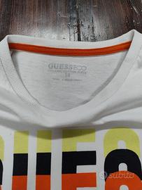 Vendo t-shirt a marchio GUESS originale, colore bianco. La maglia è caratterizzata dalla stampa "GUESS Los Angeles" sul davanti, con grafica colorata (arancione, nero e giallo