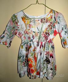 Manica 3/4, 100% cotone, colore bianco con fantasia floreale, chiusura a zip sulla schiena. In vita e a metà maniche ha cucitura a nido d'ape, interno foderato, parte inferiore a due strati. Il capo è molto carino, taglio elegante e raffinato, indossato poche volte, vero affare!