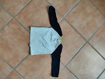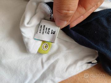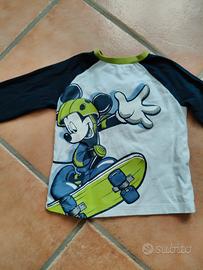 Maglietta manica lunga Disney baby per Prenatal. Utilizzata una sola volta, pari al nuovo. Taglia 9-12 mesi (76 cm). Bianca con maniche blu e dettagli verde acido, stampa di topolino sul fronte e scritta cucita sul braccio sinistro.