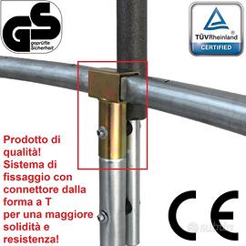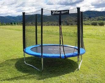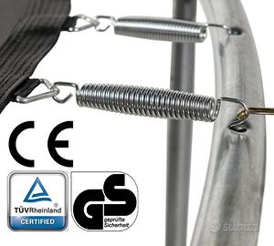 CARATTERISTICHE TECNICHE: Telaio con tubi in acciaio zincato di qualità del diametro di 38 mm e spessore 1,2 mm. Sistema di connessione con giunti a T per una super resistenza. Tre o quattro doppie gambe. Protezione molle nel bordo larga 30 cm, imbottita con spugna 12 mm. Numero 36, 48, 64 o 72 molle in acciaio zincato. Tappeto in polipropilene PP-Mesh di alta qualità. Rete di sicurezza in PP con porta di entrata. Diametro tubi della rete 25 mm. Protezione tubi in spugna. Con scaletta inclusa nei modelli 305 e 366 cm.